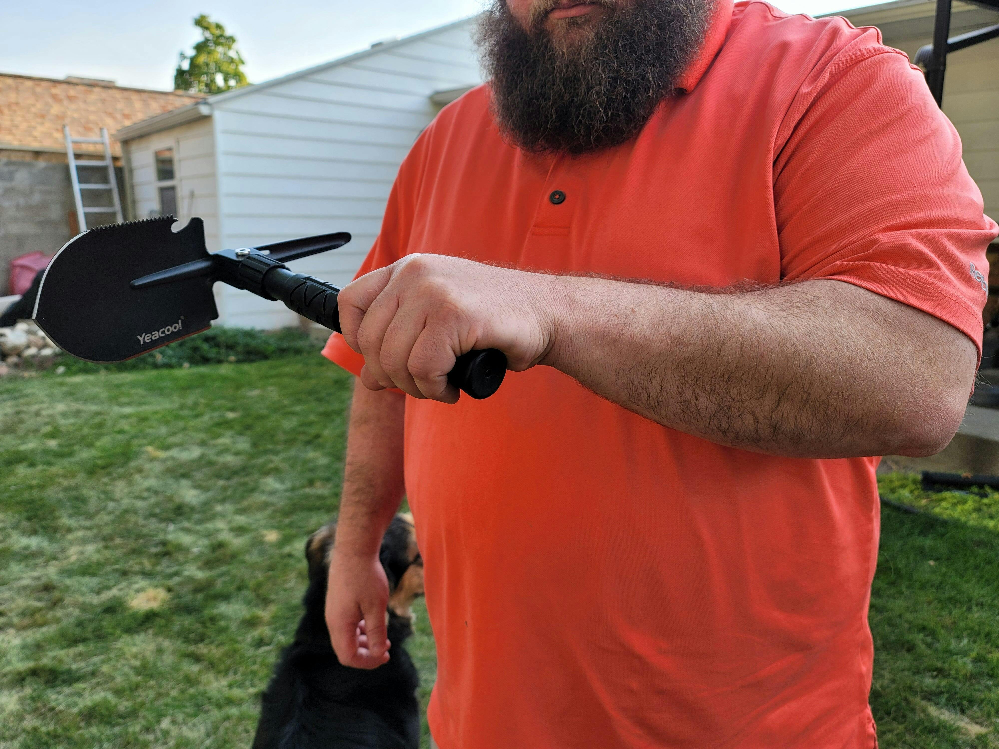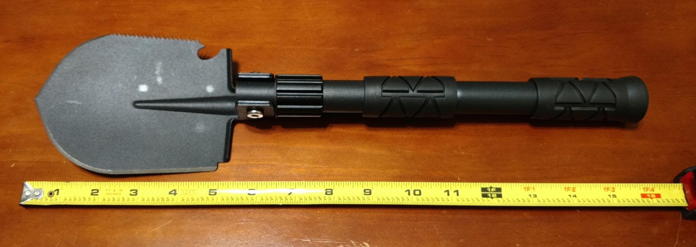 Just unfold to dig holes. Turn to 90° angle to use as hoe or pick. Use edge for sawing. Use base as hammer. When done, fold it up, put in its case, and carry on your belt or in backpack.