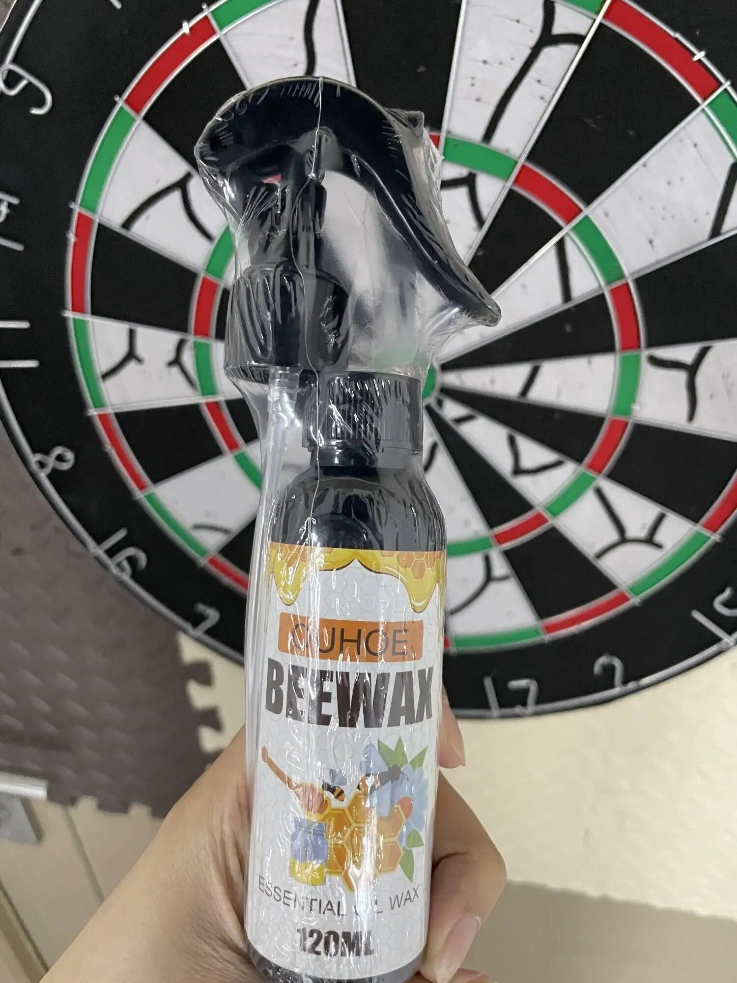 Hold bottle 6-8 inches away and spray evenly on the wood surface